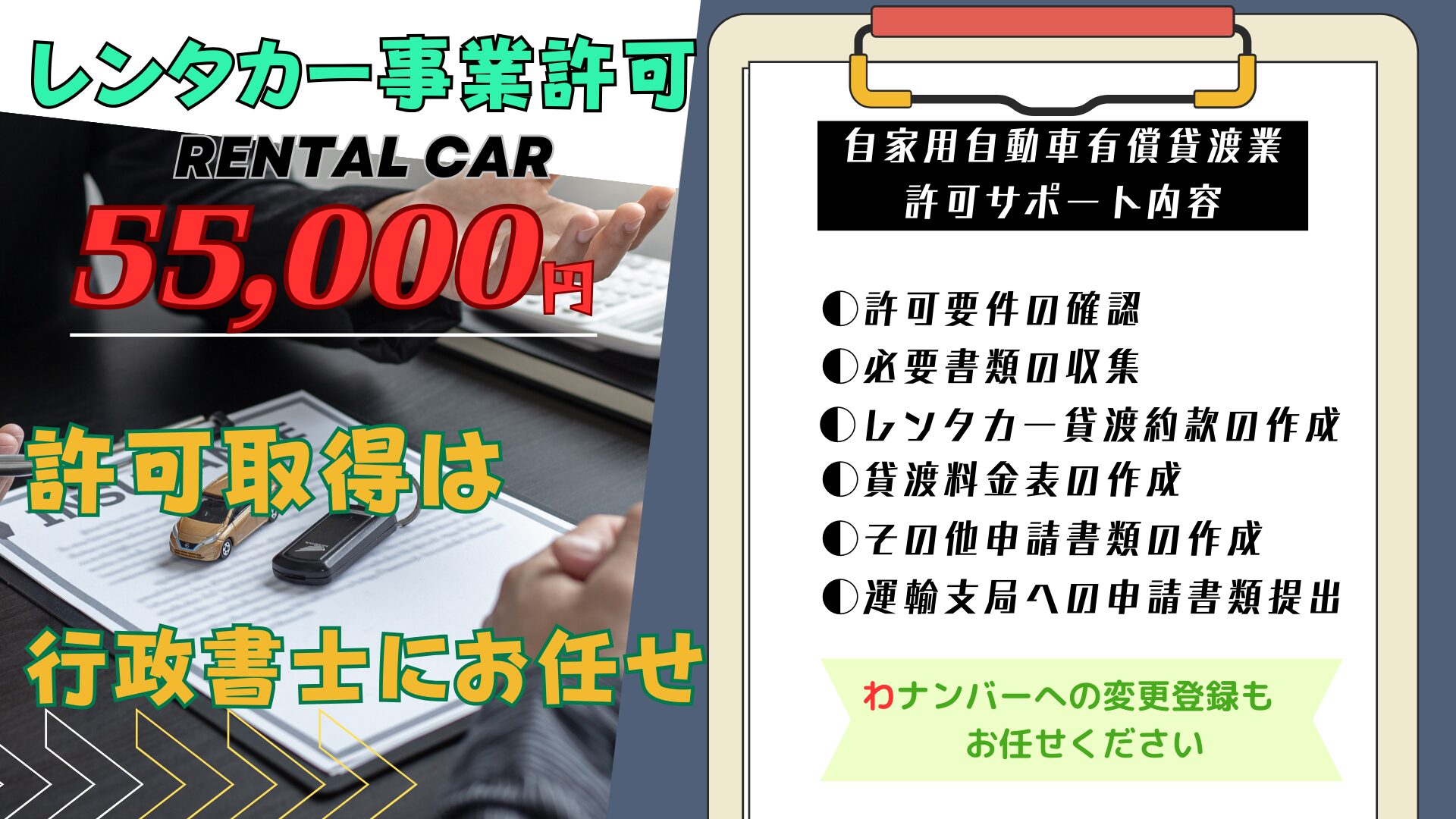 レンタカー事業 自家用自動車有償貸渡業 許可申請代行支援業務。