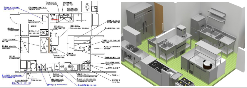 ラーメン店の厨房設計レイアウト図面 3D厨房設計施工 店舗設計デザインから内装工事、施工会社の予算と費用と料金。