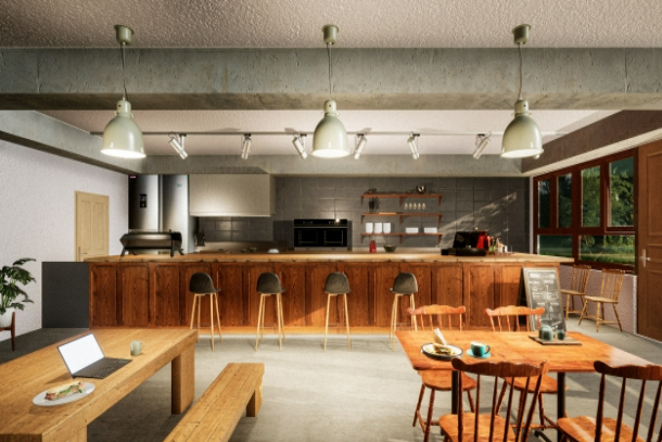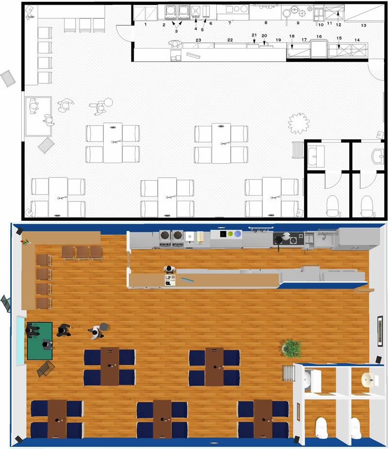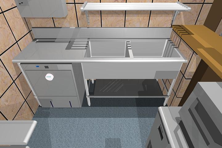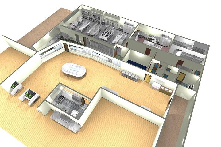 カフェ 3D厨房レイアウト例 - 業務用調理器具、食器洗浄機、冷凍庫など厨房機器∥おいしい厨房。