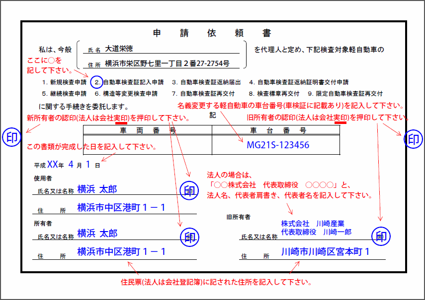 氏名住所変更 軽自動車 必要書類と記入例車検登録ユーザーマニュアル。