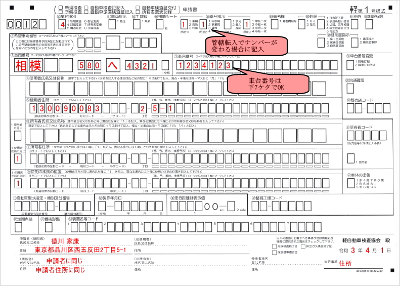 軽自動車の住所変更手続き書類の作成方法 記載変更・書き方見本。