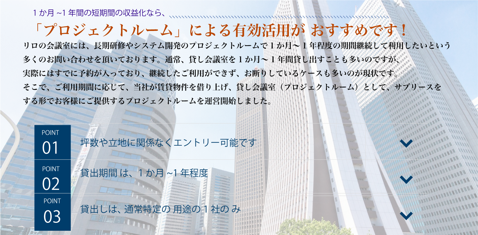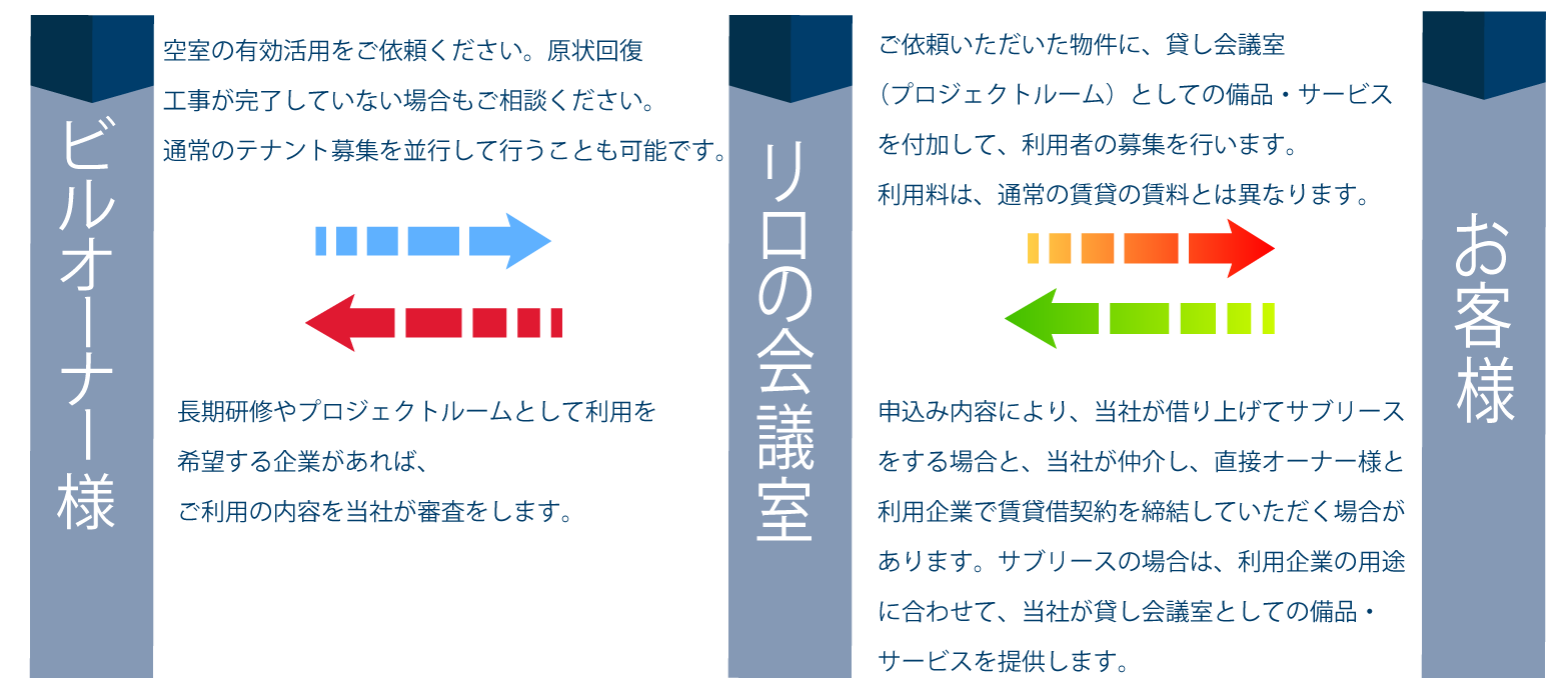 プロジェクトルームによる空きスペースや物件の長期有効活用貸し会議室・レンタルスペースなら「リロの会議室」。