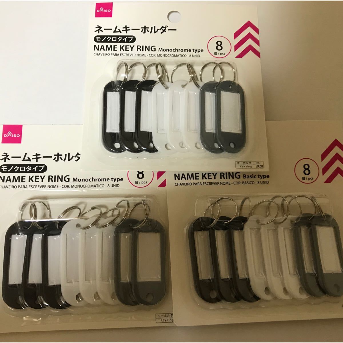 未使用ダイソーネームキーホルダーモノクロタイプ8個入り白黒グレー名札100均送料無料。