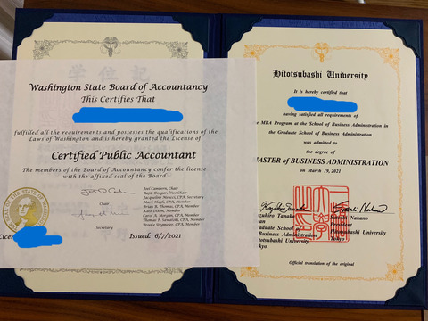 ライセンス証書がきた1型だけど、USCPAと簿記1級。