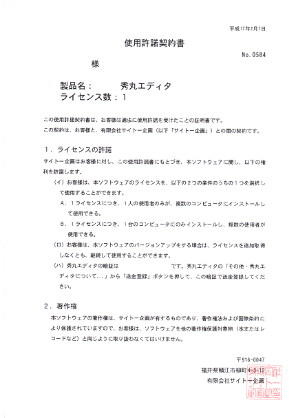 秀まるおのホームページ サイトー企画 -ライセンスの数え方、ライセンス証書 使用許諾契約書 について。