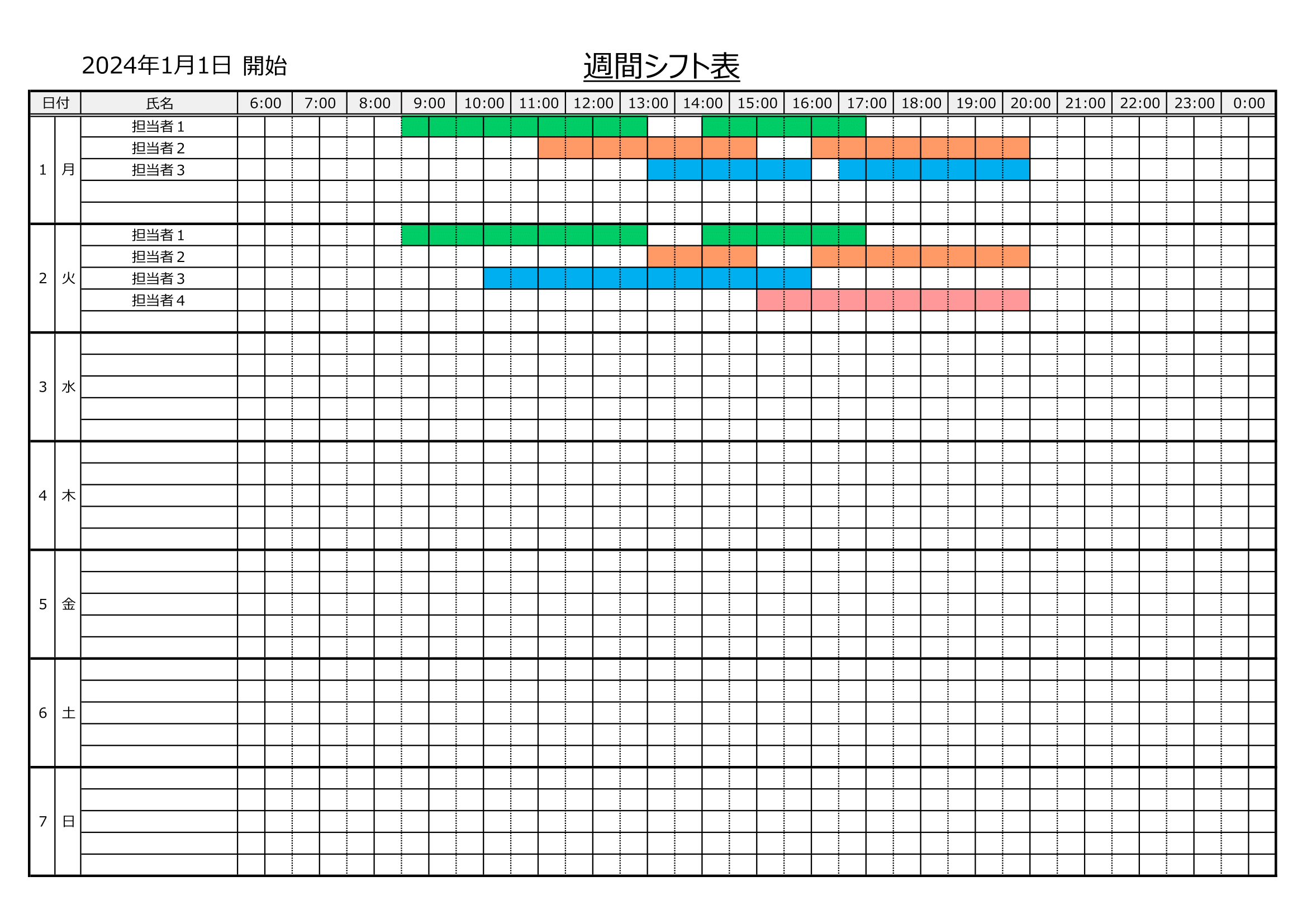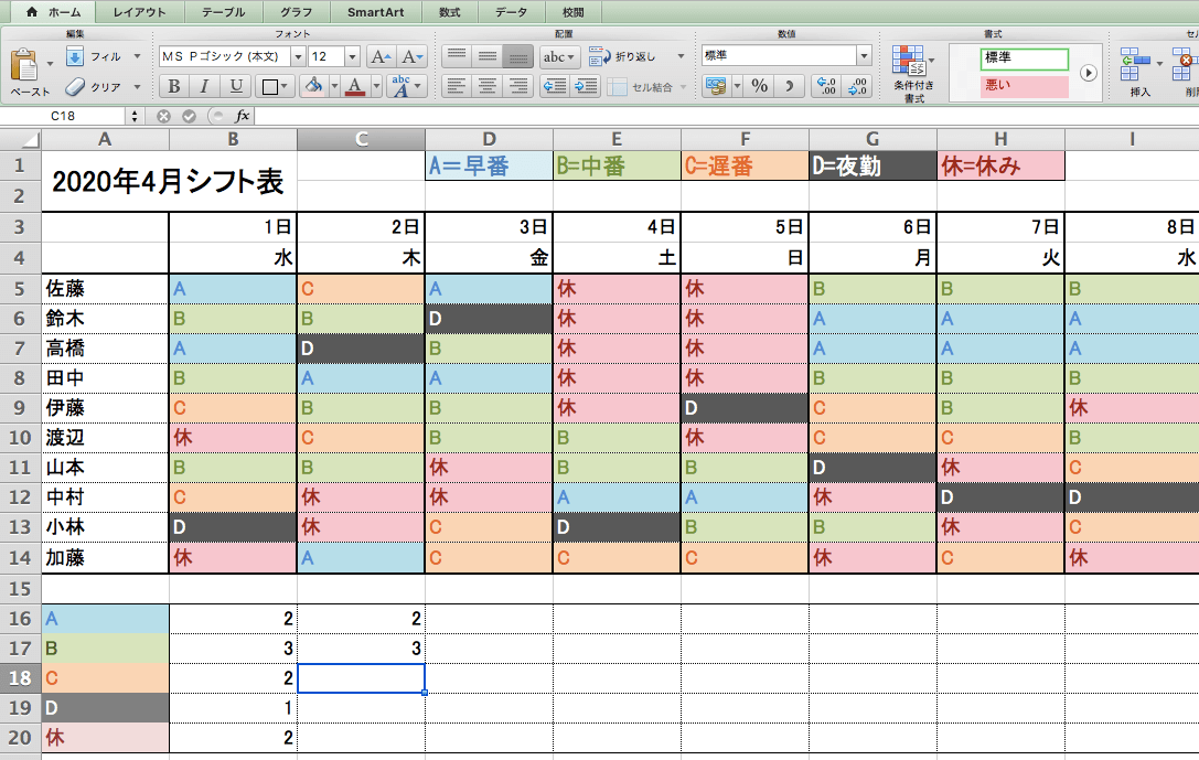 チャートで見やすいシフト表のExcelテンプレートを無料ダウンロード - 登録不要のフリーテンプレート。