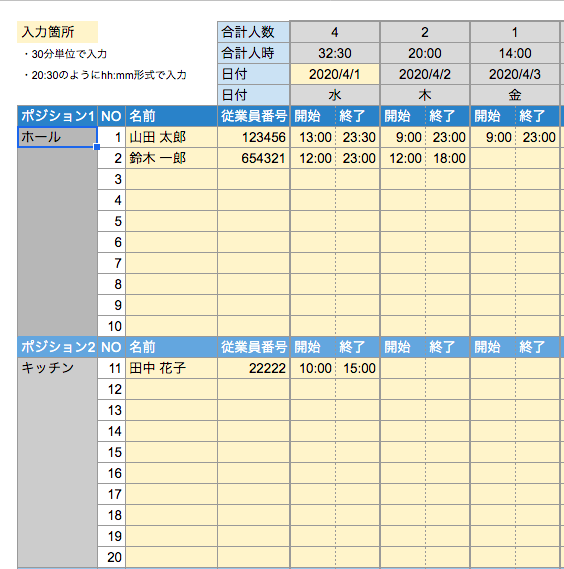 ポジション別のExcelシフト表テンプレート シンプル勤怠管理エクセルテンプレート。