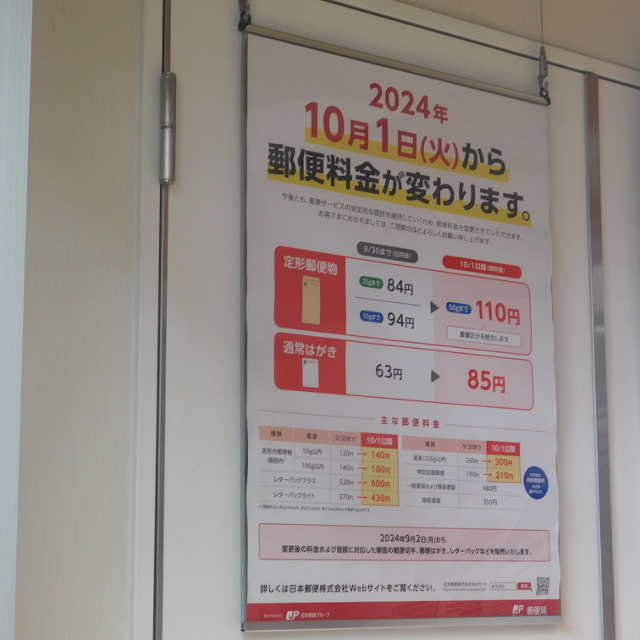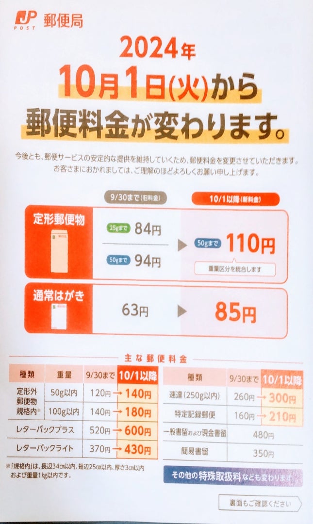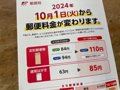 郵便料金改定のお知らせ 2024年10月1日より。