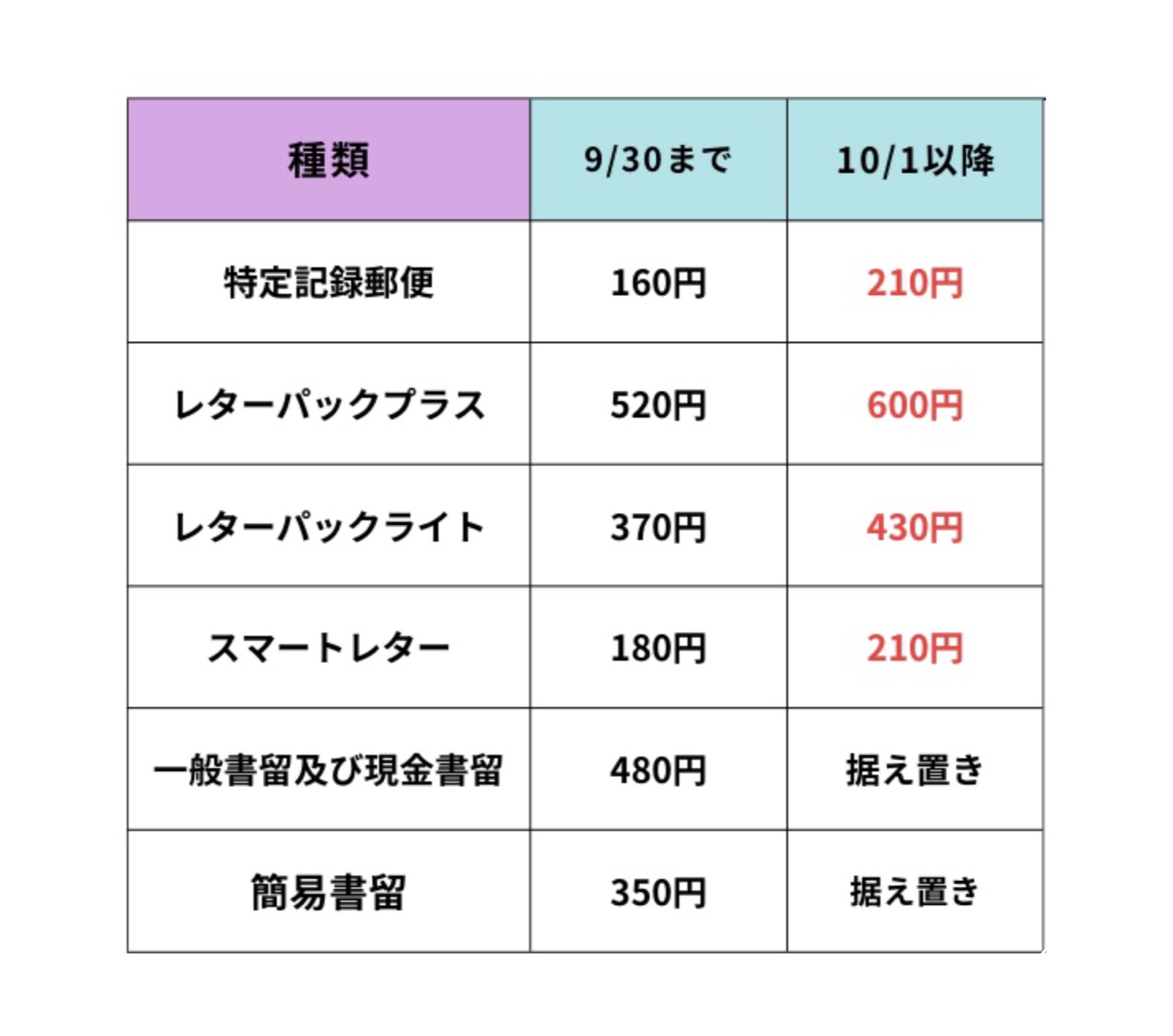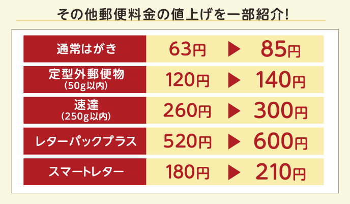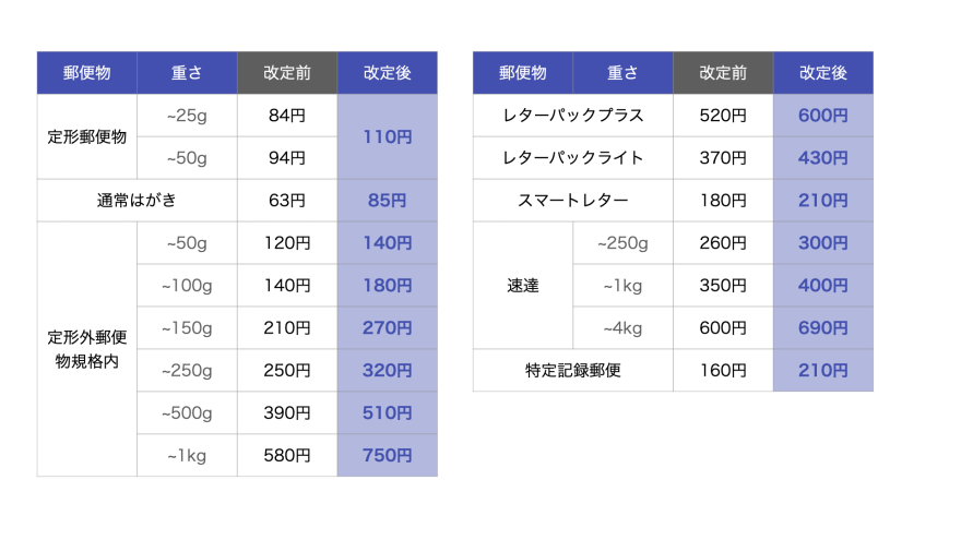 2024年10月から郵便料金値上げ レターパックなど料金の一覧表ツギノジダイ。