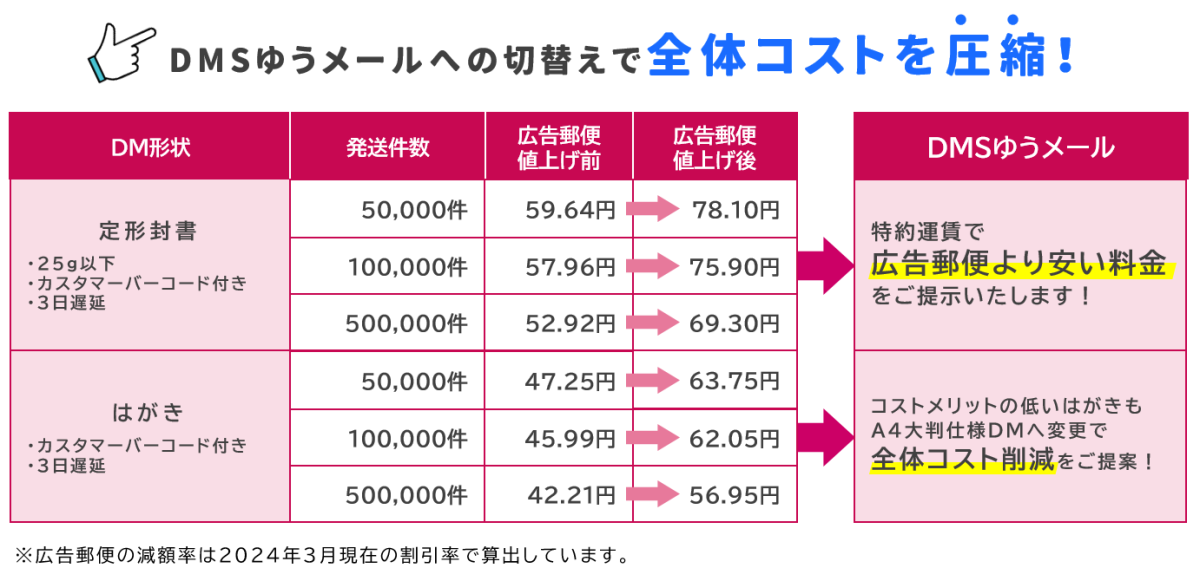 広告郵便料金早見表配布 2024年10月から郵便料金が値上げ!株式会社ディーエムエス。