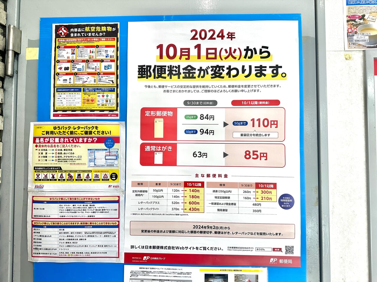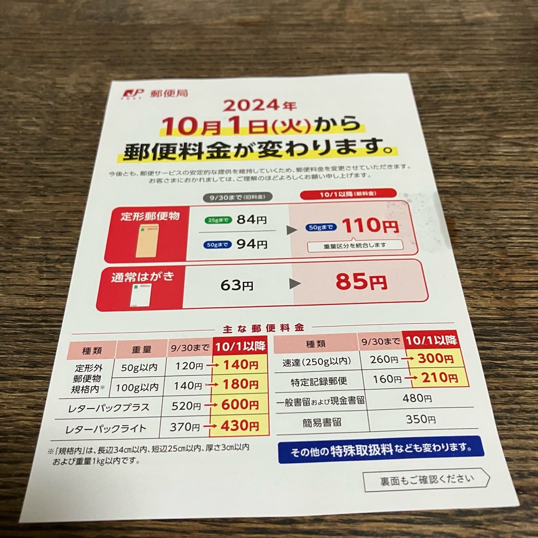 TNNB on X: "郵便局で2024年10月1日からの郵便料金の値上げの告知チラシ をもらった。フリマアプリの台頭で個人間売買が増えて小物の配送量が激増した影響もあるのかなぁ。特にレターパック各種の値上げ 金額エグすぎちゃん ここまで大幅な値上げって過去にあったかしら。