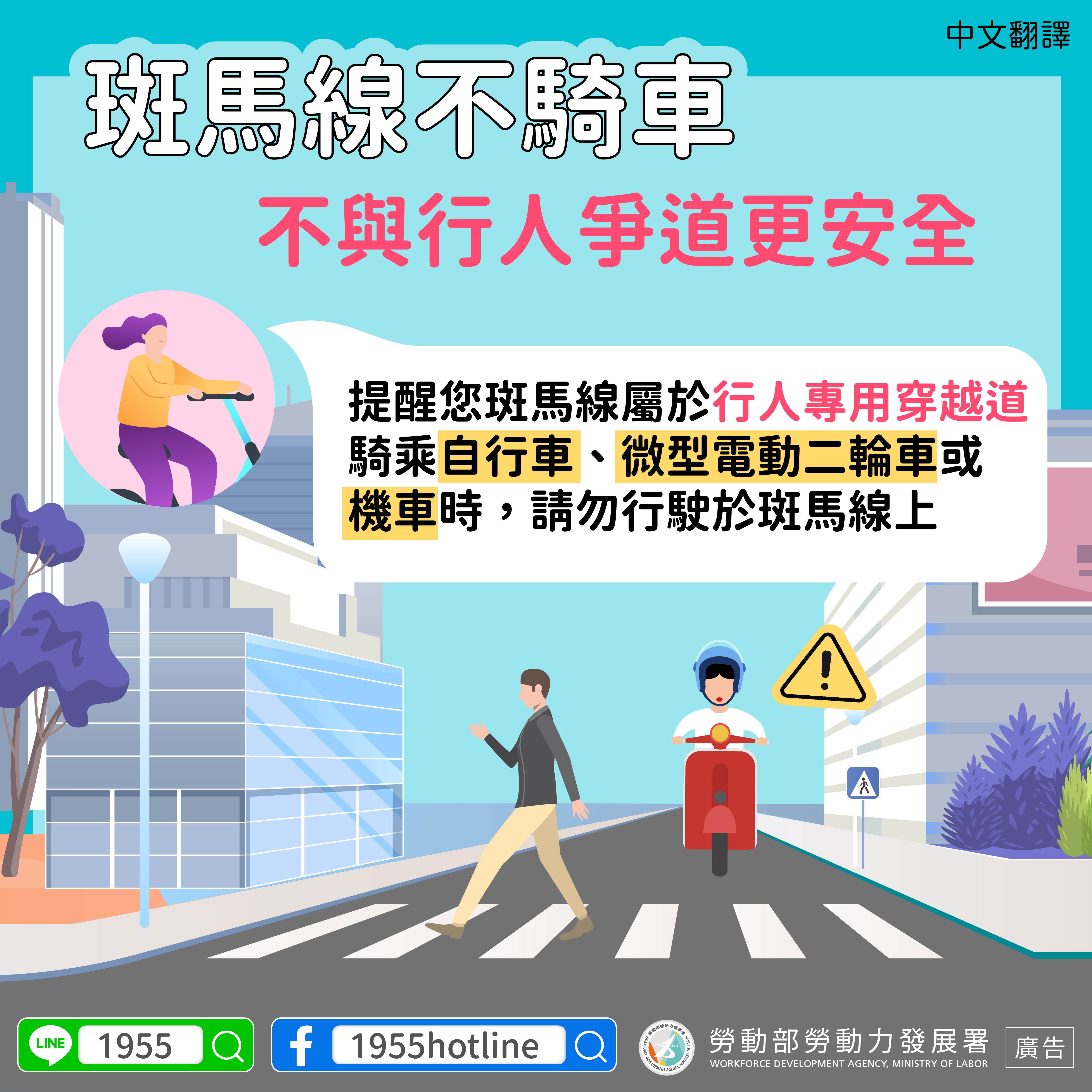 LINE@移點通- 斑馬線不騎車 -多國語言版-宣導品-宣導專區-外國人勞動權益網-勞動部勞動力發展署。