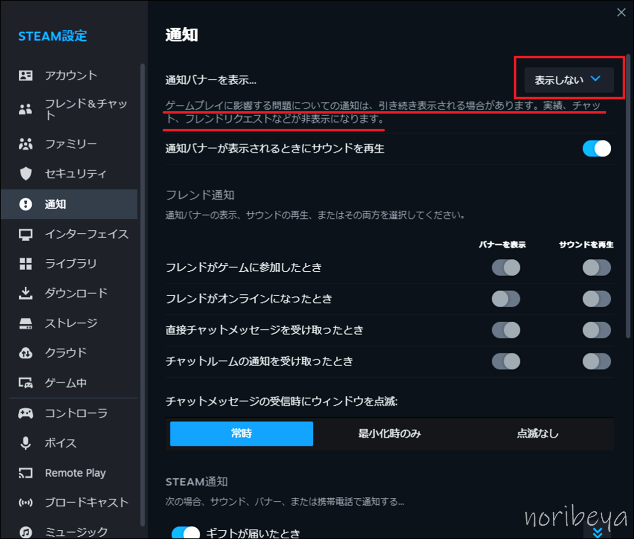 Steamの右下のお知らせポップアップを非表示・止める方法。フレンドのオンライン、プレイ開始通知を消す方法 ゲーム配信・実況のりべや。