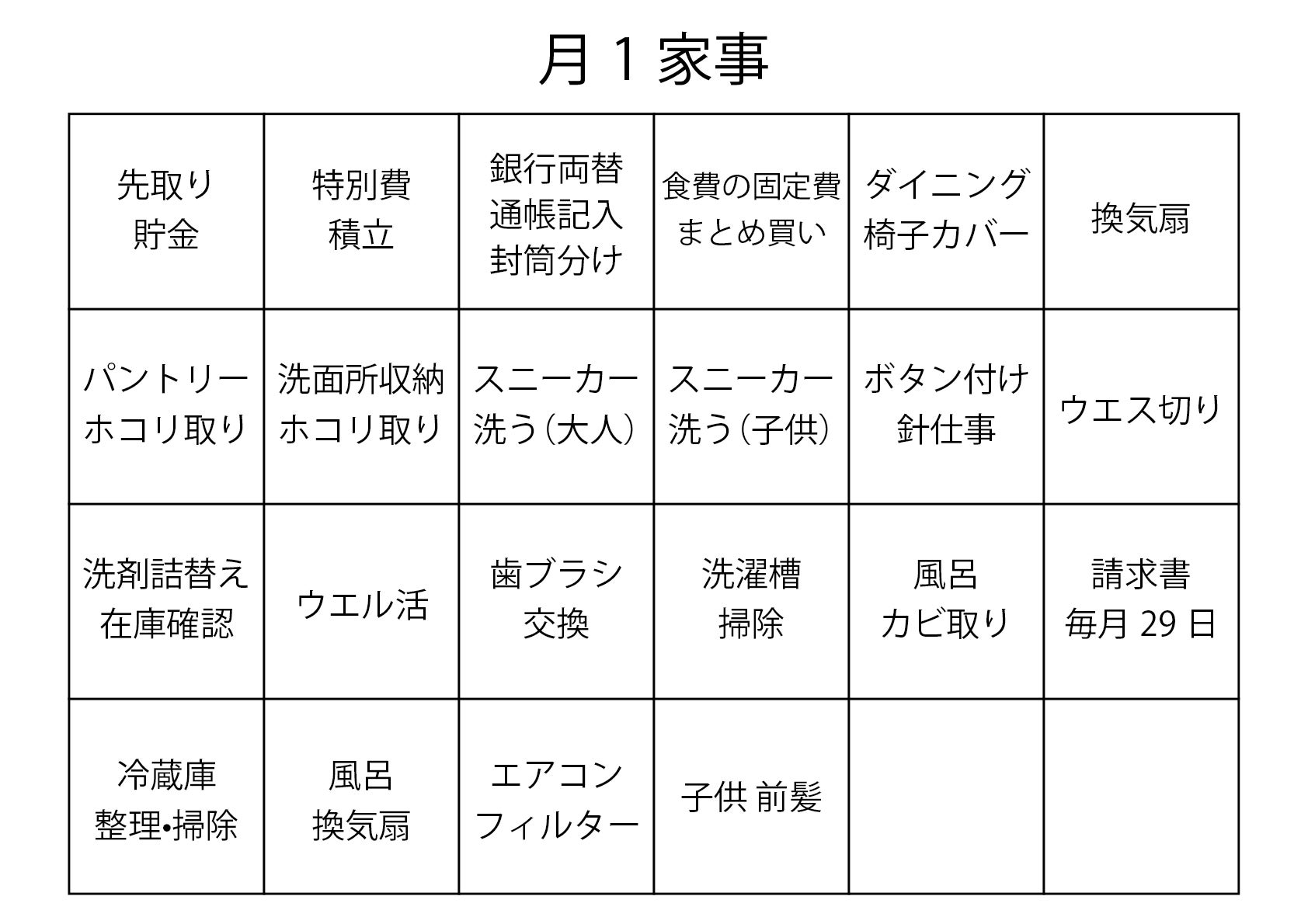 月1家事は塗りつぶして達成感節約彩りLIFE ぽこりんママの家計管理・貯金・主婦の知恵ブログ。