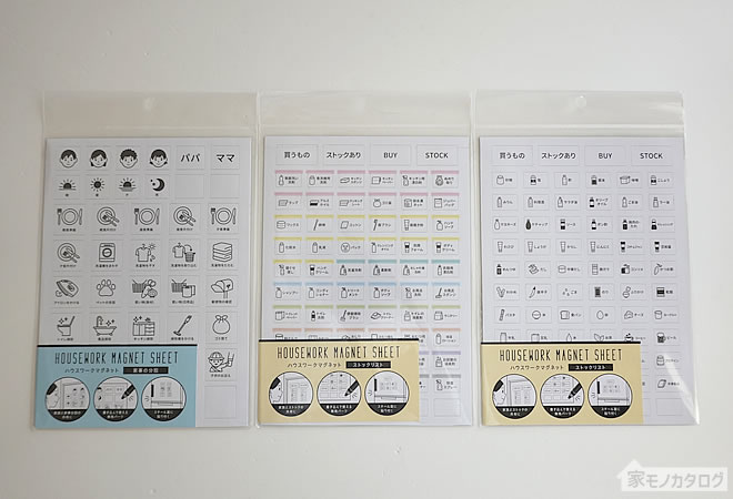 100均キャンドゥの「ハウスワークマグネット」の商品一覧。家事の分担とストックリストの種類。
