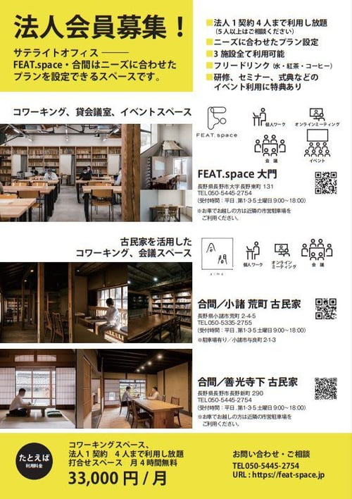 法人会員様募集! リモートワークもセミナー・イベントもOK!新しい働き方をFEAT.space・合間 aima でFEAT.space。
