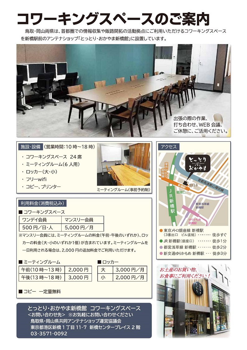 コワーキングスペースのご案内 料金や使用条件を見直しました- とっとり・おかやま新橋館鳥取県×岡山県アンテナショップ 公式WEBサイトとっとり・おかやま新橋館鳥取県×岡山県 アンテナショップ 公式WEBサイト。