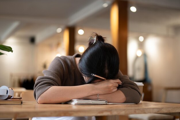 疲れて眠いアジア人女性が、コーヒーショップでリモート作業中にテーブルで居眠りをしているPremium写真。