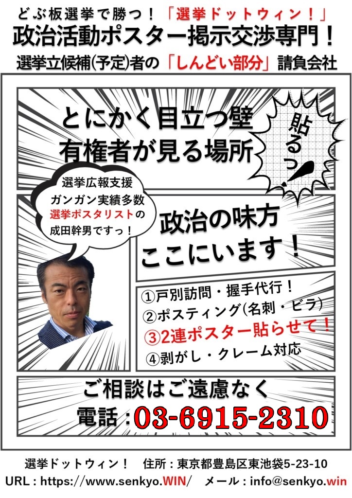 立札看板設置交渉代行 選挙ドットウィン! どぶ板選挙代行 どぶ板広報支援 ポスター新規掲示 選挙広報支援 選挙広報サポート ポスター掲示許可貼りポスター掲示承諾貼り 事前街頭ポスター貼り 街頭演説会 ポスター貼り 代行 党員獲得代行 党員募集代行 掲示責任者代行。