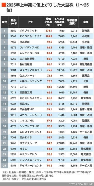 3位は無印、2位がスシロー、では1位は? 2025年上半期に株価が上昇&下落した「大型株」ランキング100+100社企業ランキング東洋経済オンライン。