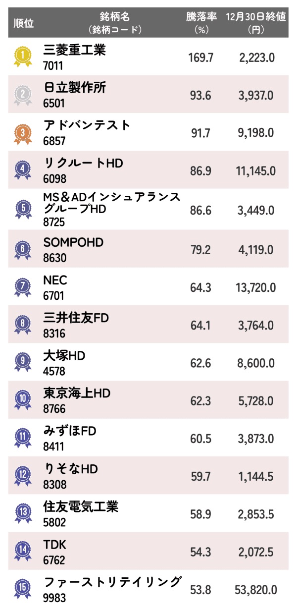 2024年の日本株を騰落率で振り返る:値上がりトップは三菱重工、値下がりトップはレーザーテックトウシル 楽天証券の投資情報メディア。