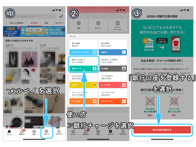 メルペイの使い方〜銀行口座の登録方法について〜メルペイ メルカリアプリでかんたんスマホ決済。