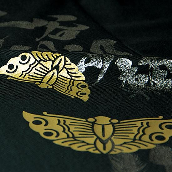 バックには「違い鷹の羽」の家紋と羽根のイメージがデザインされ、フロントの裾には「対い蝶」の家紋 がアクセントに。グリッターの使用により控えめながらも存在感のある、重厚感あふれるデザインです。