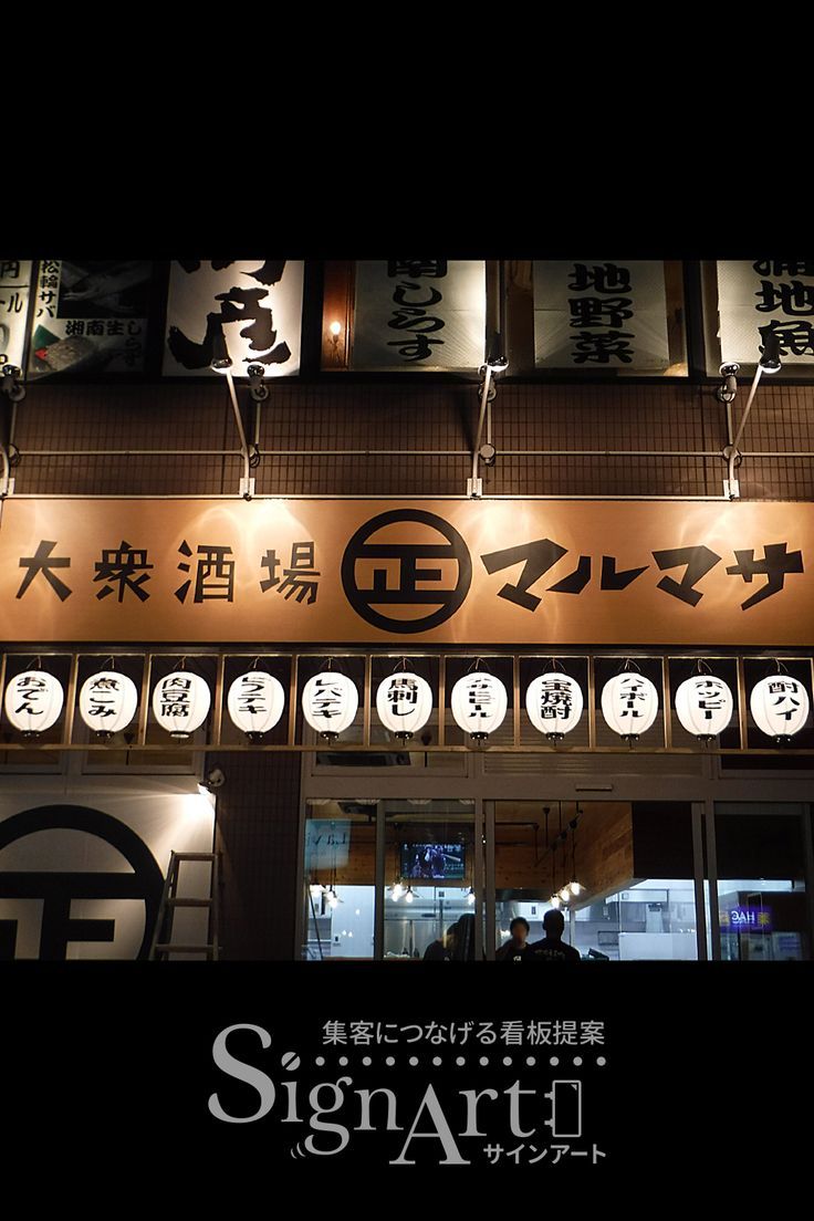 居酒屋のメイン看板を提灯や照明に合わせて製作:大衆酒場マルマサ横浜の看板屋サインアート。