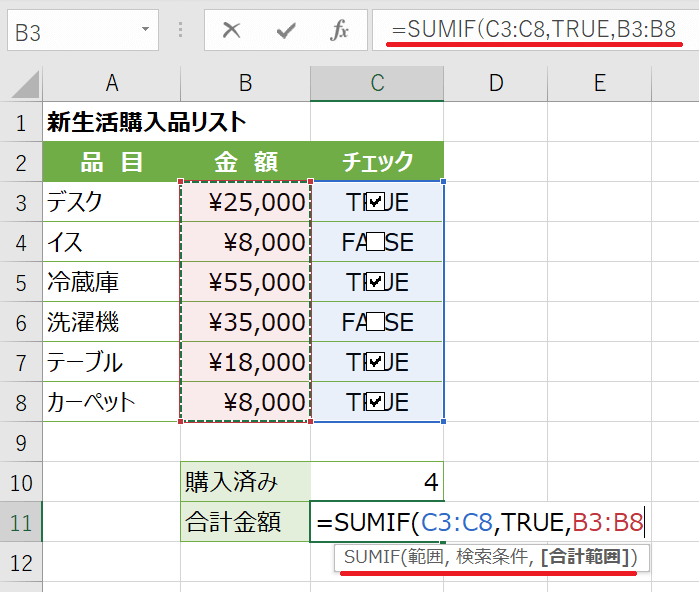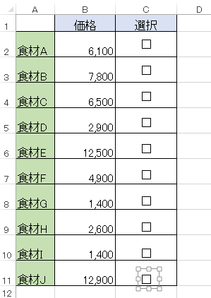 Excelのチェックボックスをセル内で使用する方法自動合計金額計算。