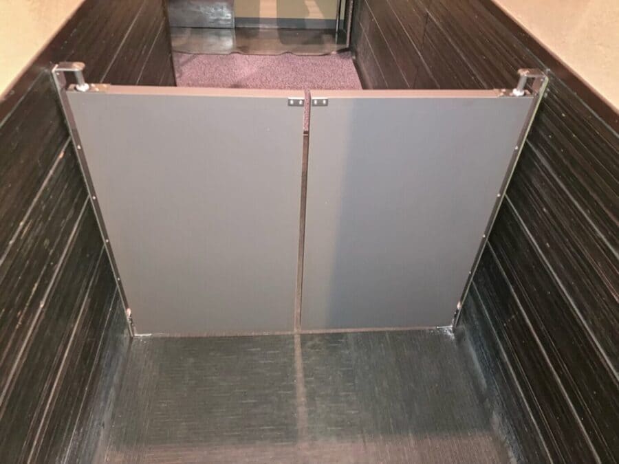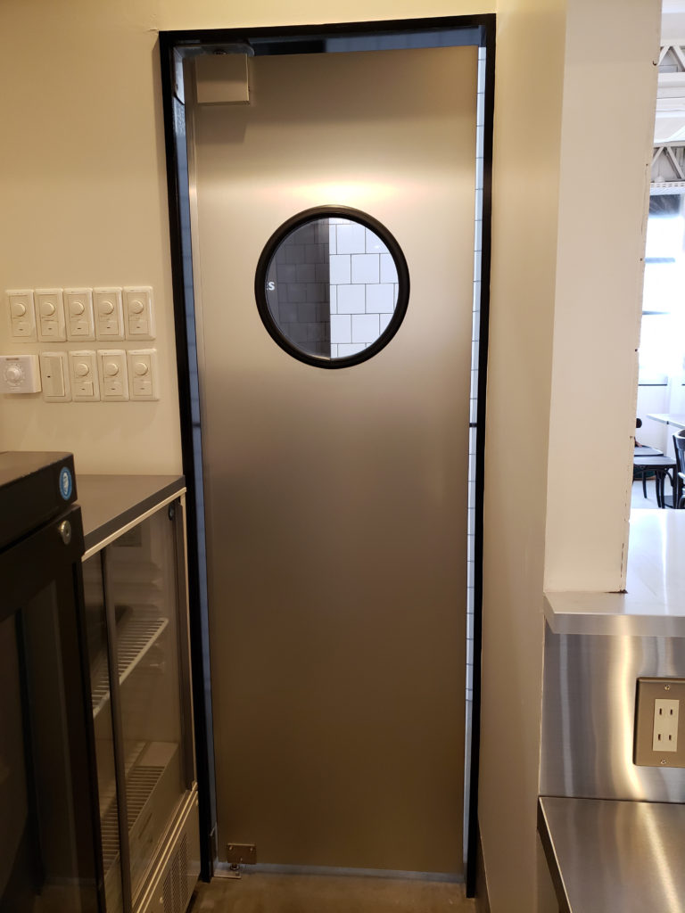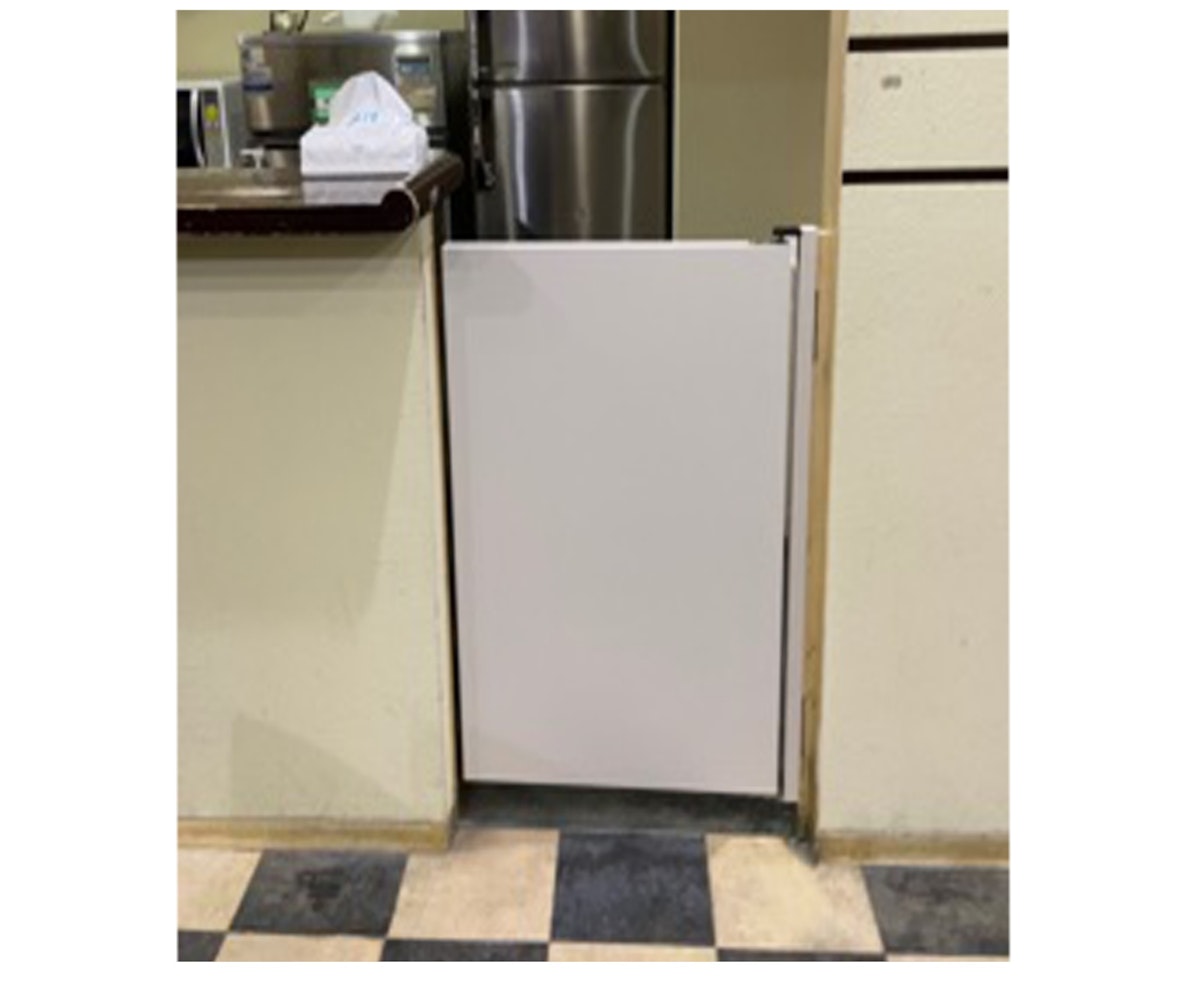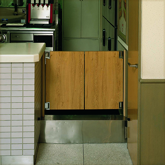 劇場、厨房前ミニスイングドア 90°ストッパー付き 、マグネットキャッチ導入事例スイングドア工場直販.com。