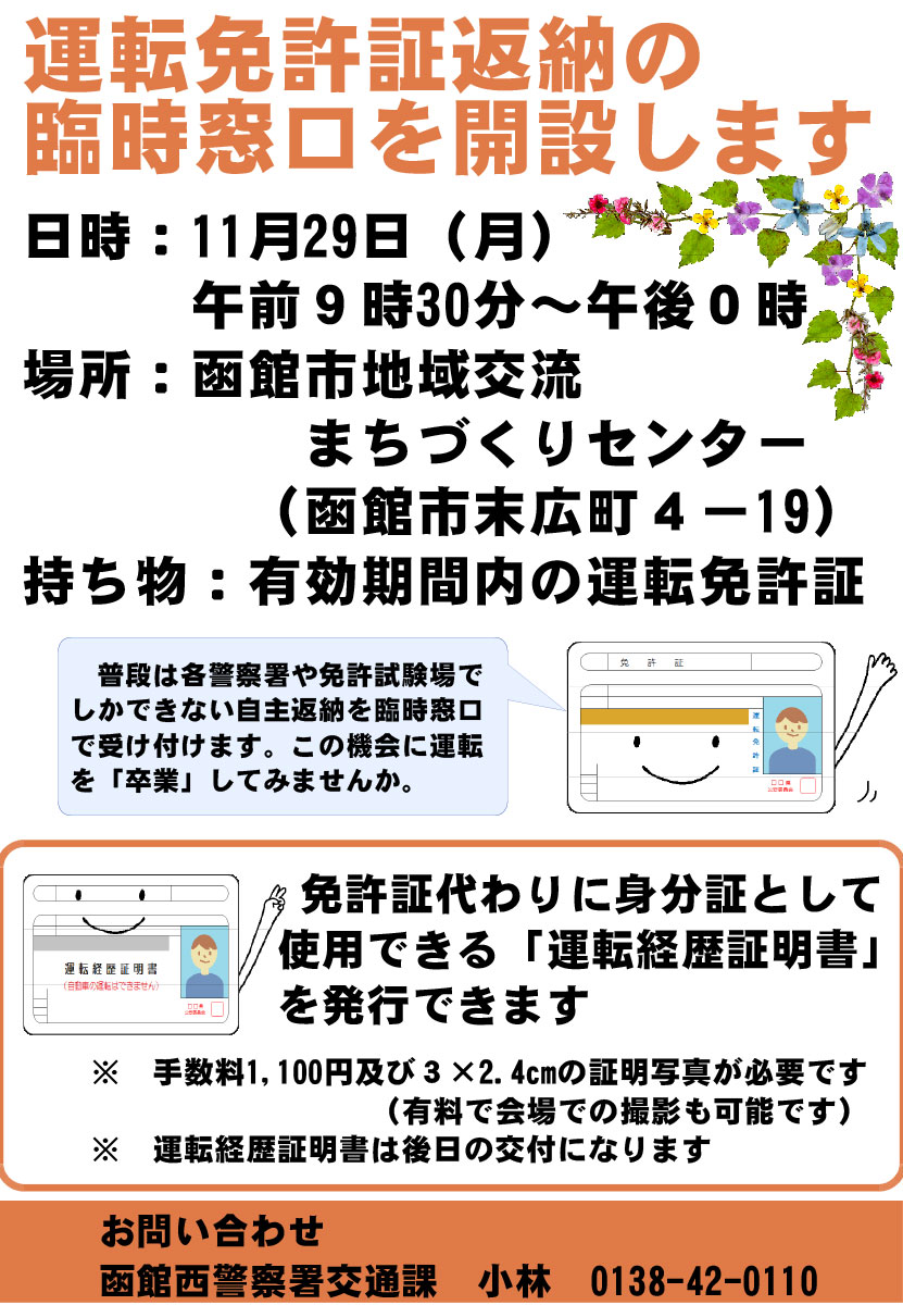 9月限定で、金沢西警察署の窓口で運転免許証の返納手続きをされた方に運転卒業証書を贈呈します。 交番で手続きされた方は対象外となります。また、運転免許 の返納を迷っている方、そのご家族の方は、お気軽にご相談のお電話 076-266-0110 をどうぞ金沢区金沢区。