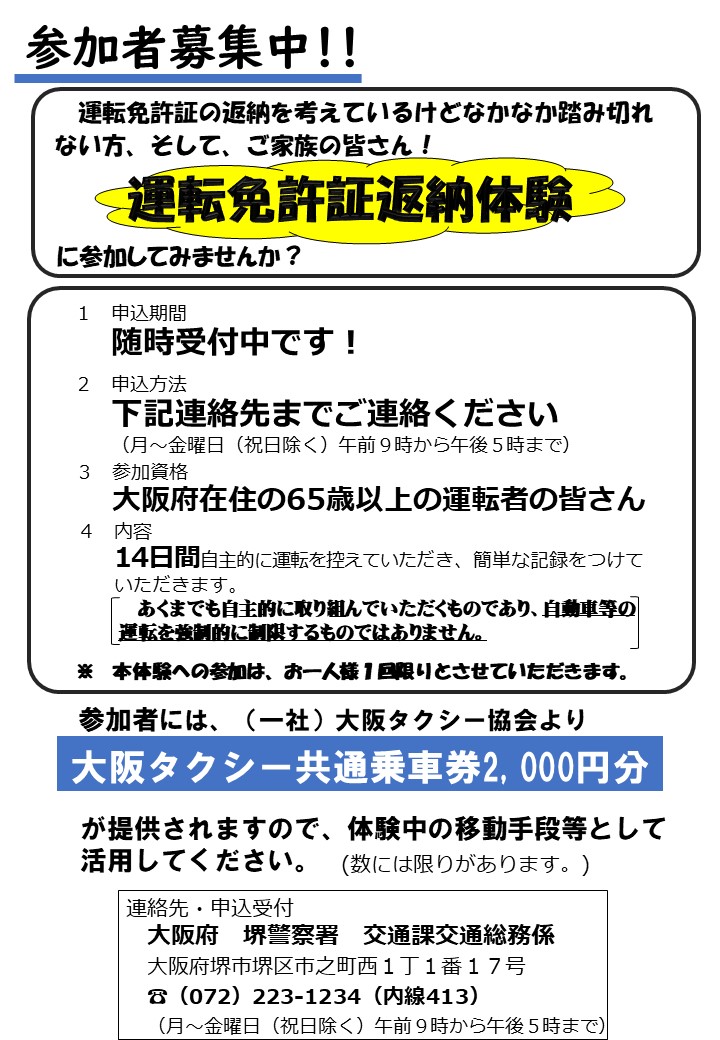 運転免許証返納体験」参加者募集中!! 大阪府警本部。
