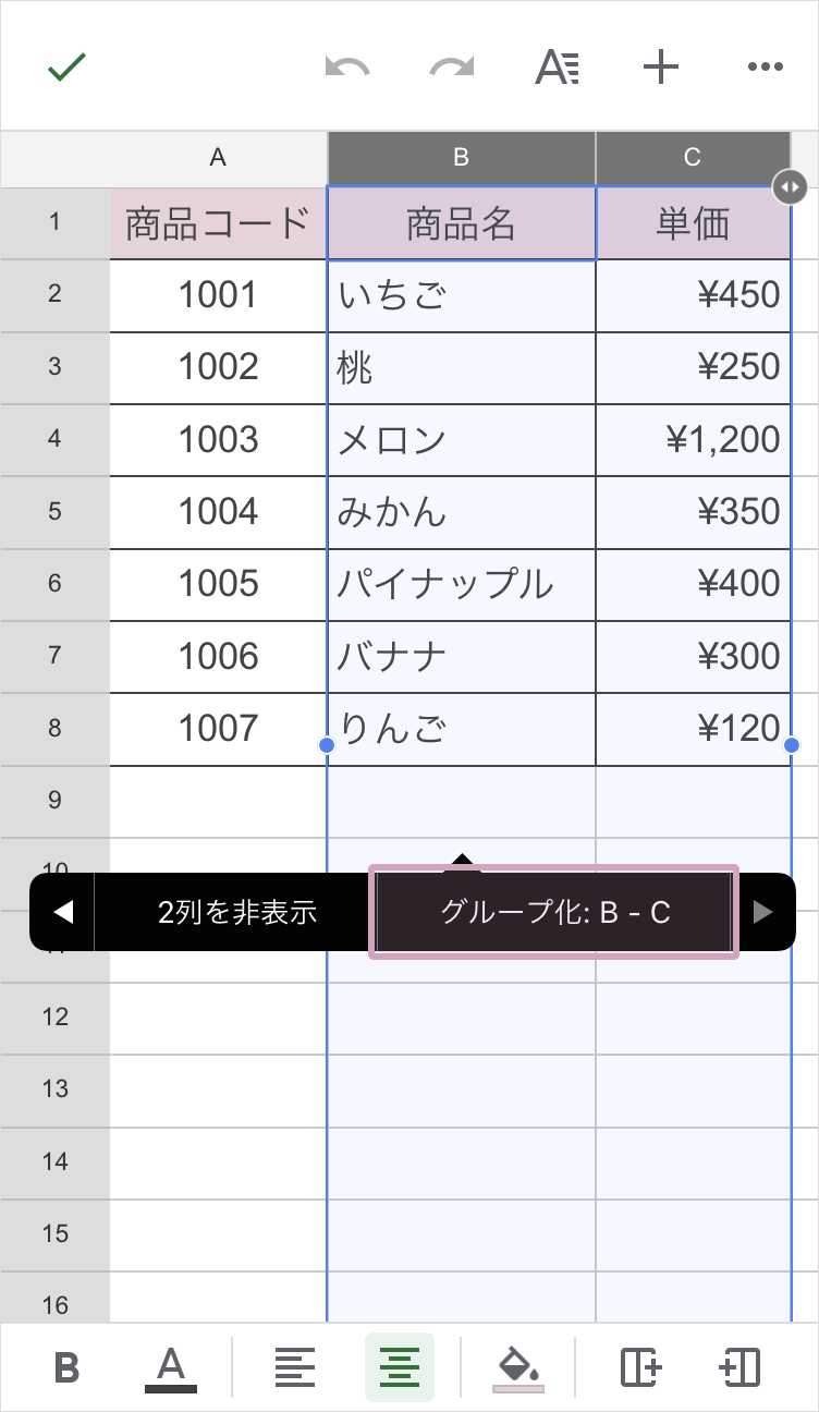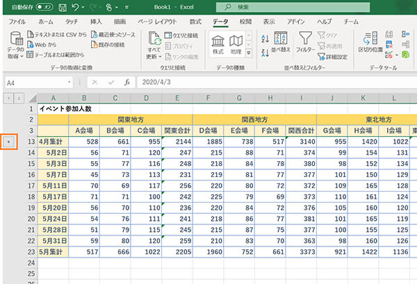 グループ化で列や行を折りたたみ、展開するスプレッドシートの使い方。