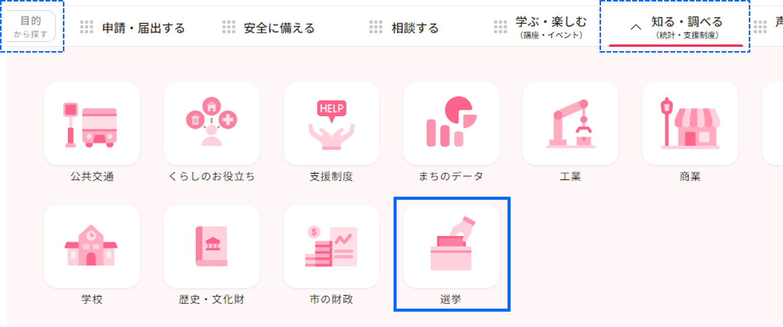 目的から探す」に「選挙」アイコンを追加しました函館市。