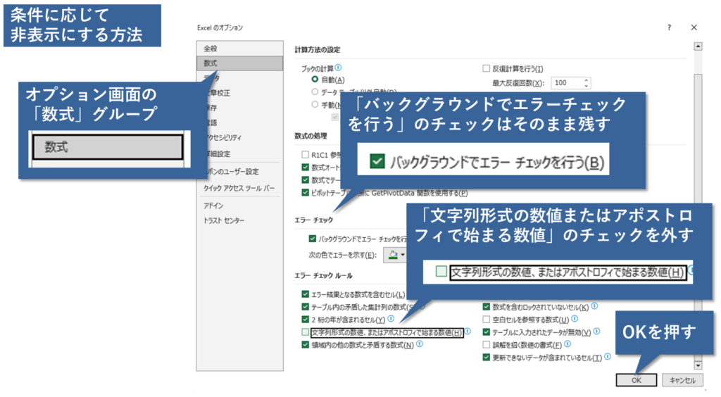 Excel セル左上の緑の三角を消す 表示させない 方法カラバリ。