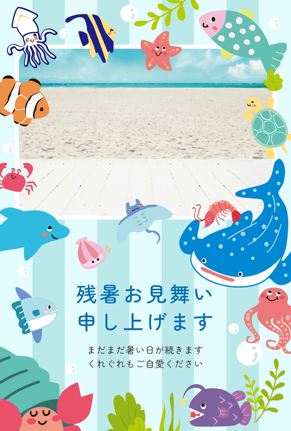 海の生き物がたくさんの残暑見舞い向けカードの無料チラシテンプレート 14183 - デザインAC。