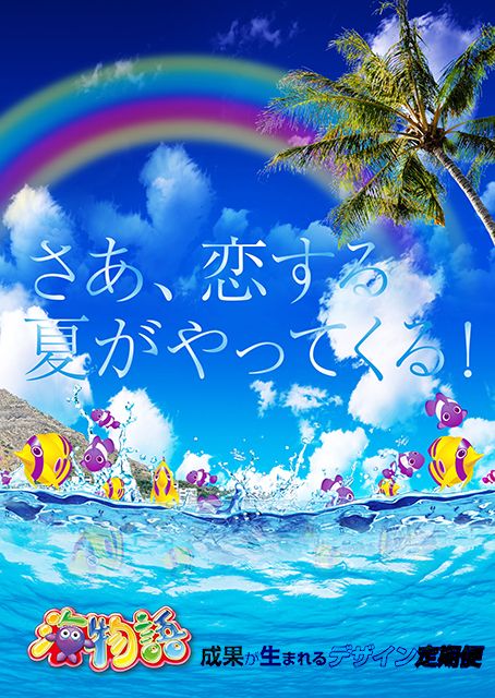 海とヤシの木の写真を大きく使った海開きのポスターの無料チラシテンプレート 14903 - デザインAC。