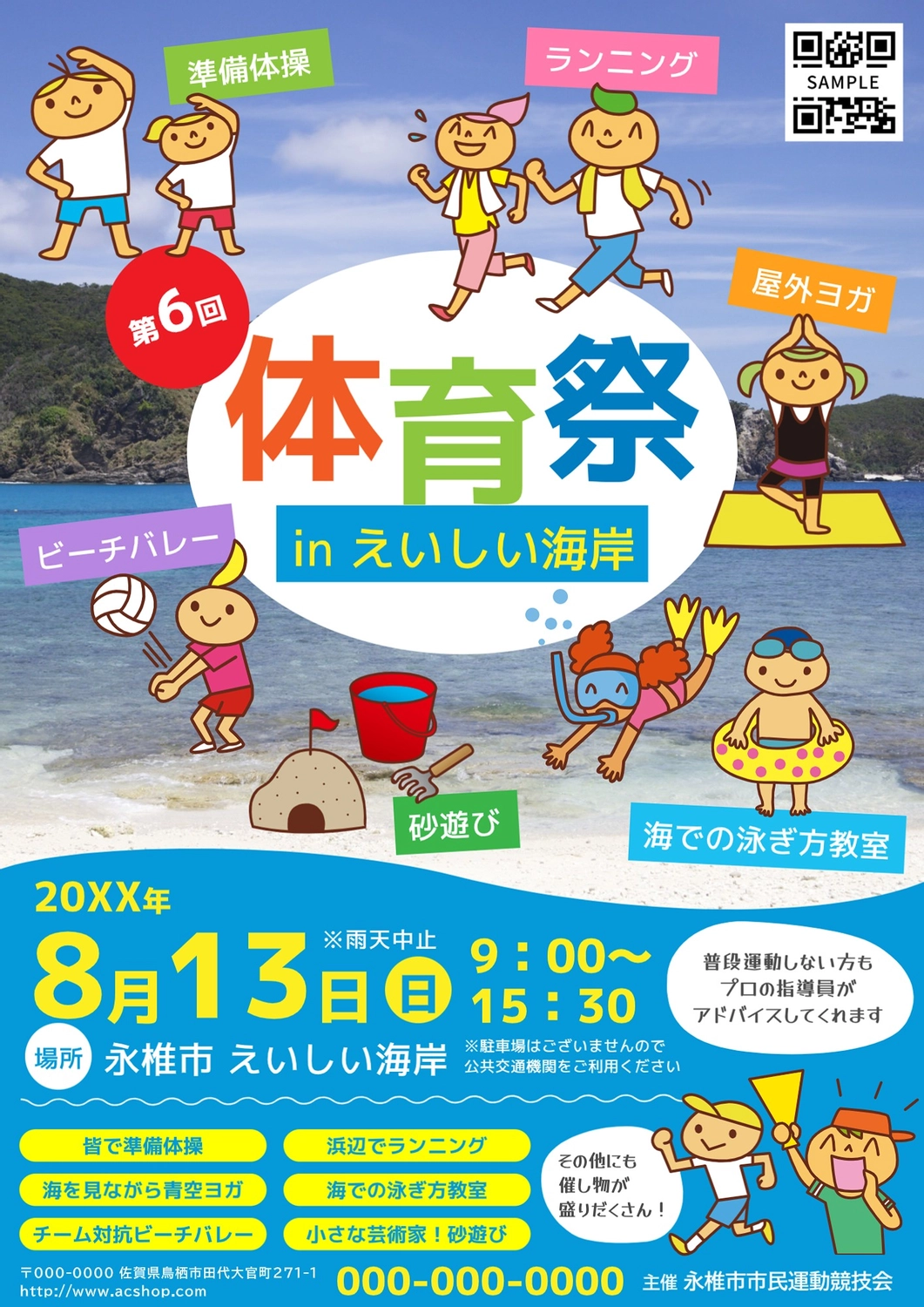 海の写真をベースにして親子のイラストを使った体育祭のチラシ の無料チラシテンプレート 14488 - デザインAC。
