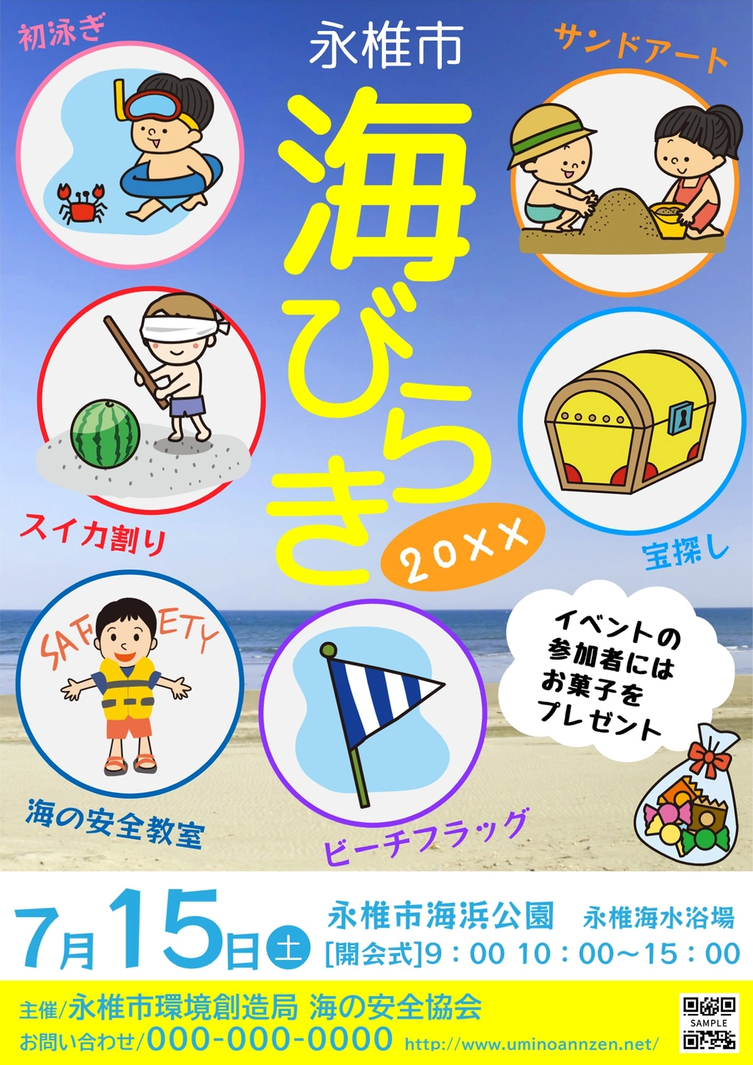 子供のイラストを使った海開きのポスター の無料チラシテンプレート 14952 - デザインAC。