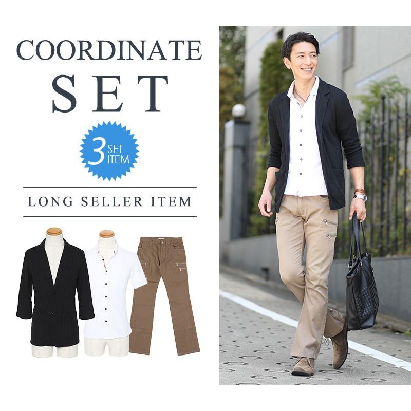 黒ジャケット×白シャツ×ベージュパンツのコーディネートセット 215。