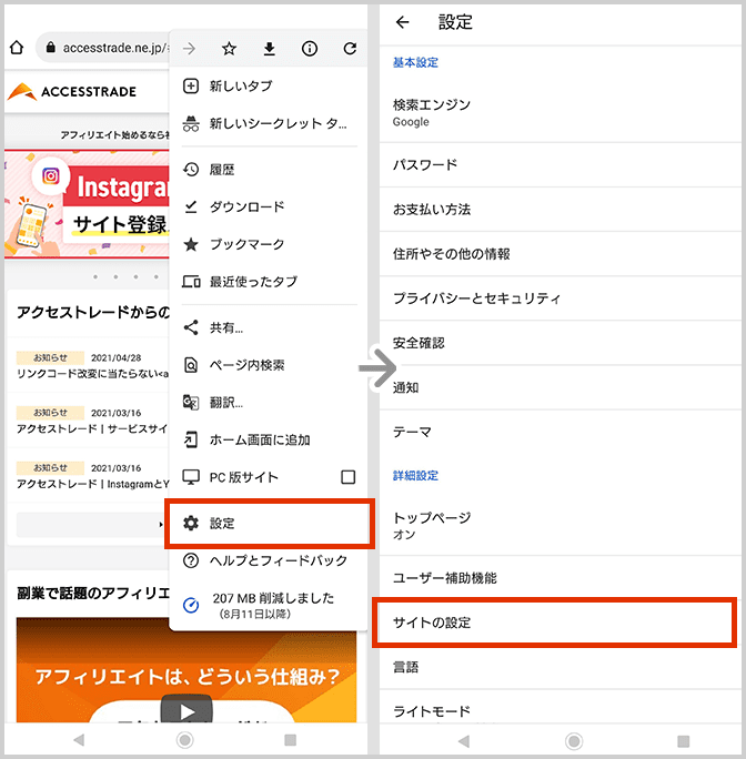 Chromeブラウザ スマートフォン Androidの設定方法。
