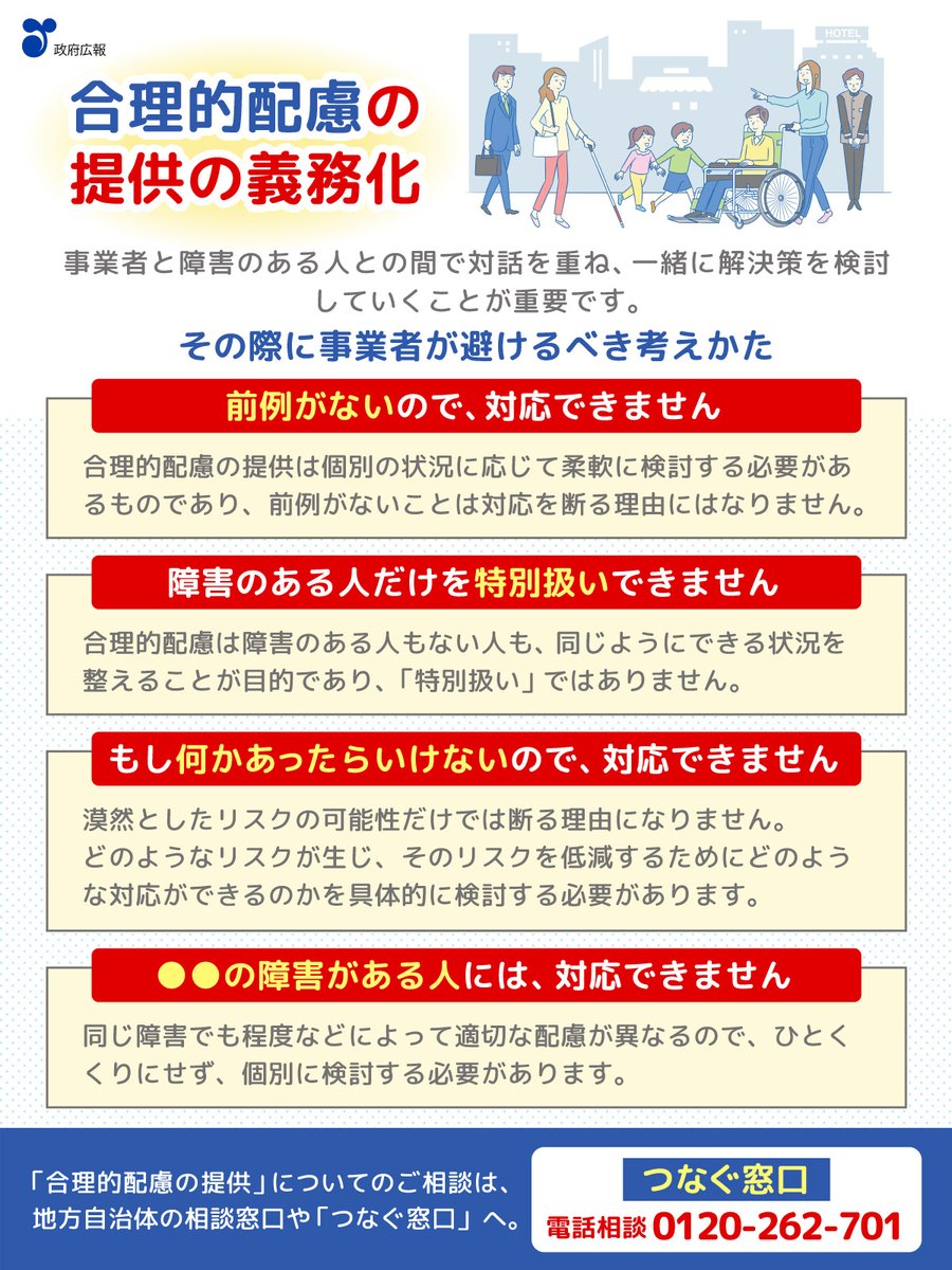事業者のみなさまへ \ 4月から事業者による障害のある人への合理的配慮の提供が義務化されました。主な障害特性や合理的配慮の具体例についてあらかじめ確認した上で、個々の場面ごとに柔軟な対応の検討をお願いします。https:gov-online.go.jp article 202402。