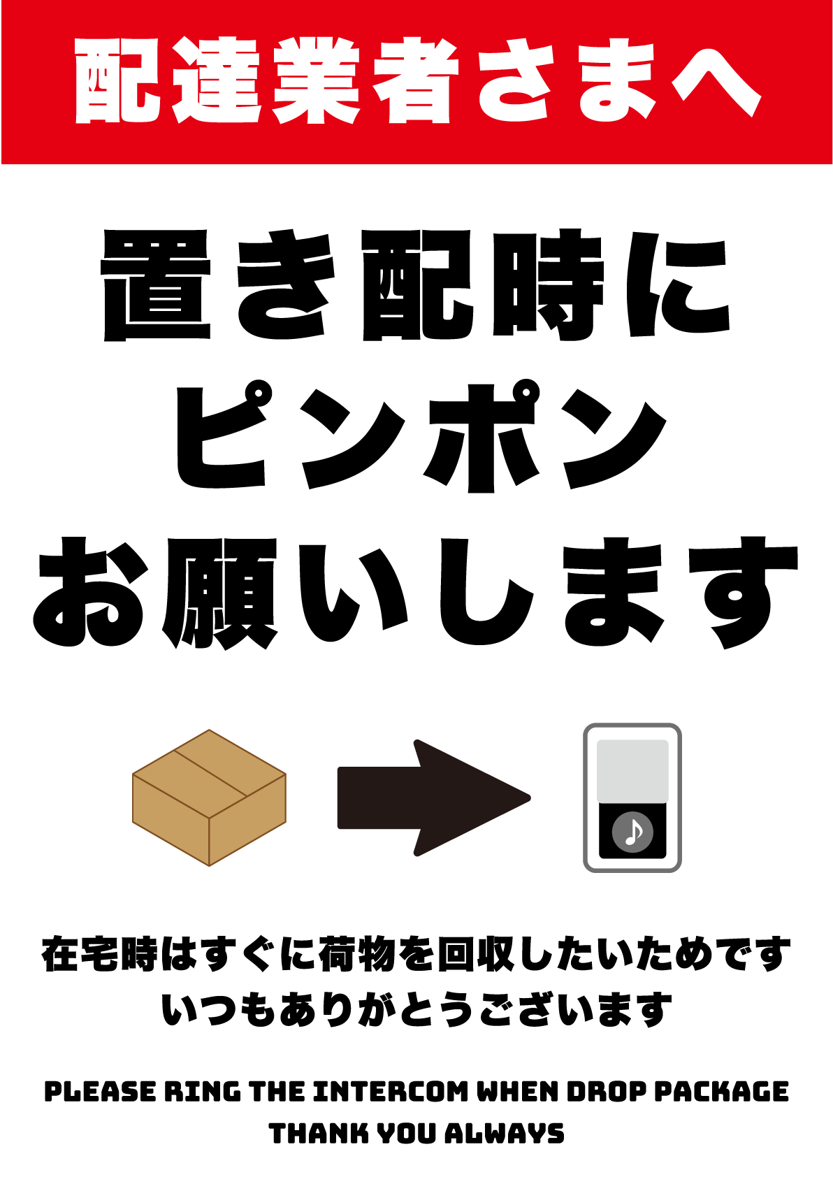 置き配張り紙・お知らせのテンプレートとなり宅配ボックスがない場合や自宅にいても配達員に直接会うことなく、数分後に玄関に取。