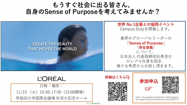 満員御礼 あなたにとっての”Sense of Purpose” とは? ~世界業界No1企業が社会で果たす役割から考える~All seatsreserved L'ORÉAL Campus Duty2022 at Waseda University – 早稲田大学 キャリアセンタ。