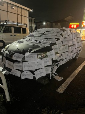 車に張り紙駐禁じゃありません茨木市・高槻市の電気屋、住まいるでんき館きょうしん。