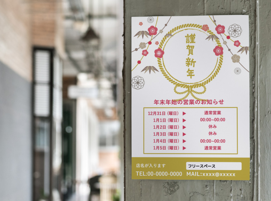 無料チラシテンプレート - 年末年始の告知向けチラシデザインASOBOAD。