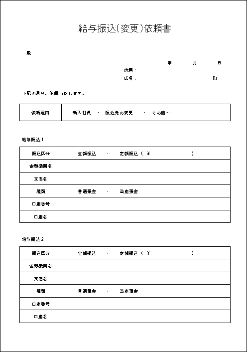給与振込 変更 依頼書 労務 管理 エクセルテンプレート - 無料ダウンロード。
