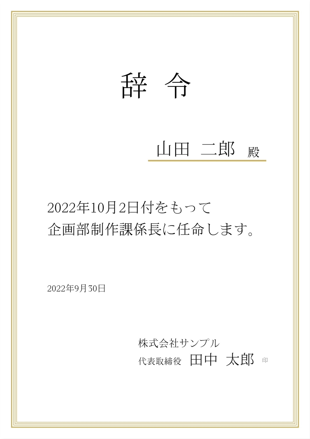 辞令書の用紙:横書きと縦書きの2種類のフォーマット書き方の例文一般的な書式 - フリーテンプレート。