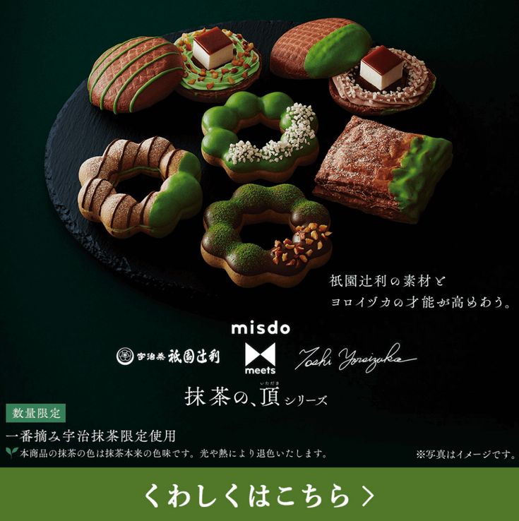 飲料・食品、スタイリッシュ・おしゃれ、高級感・きれいめ、シズル感、和風、ロゴ・作字のバナーmisdo meets 祇園辻利 ToshiYoroizuka 抹茶の、頂シリーズミスタードーナツBANNER LIBRARY。