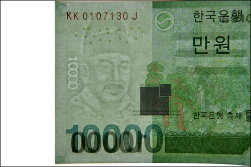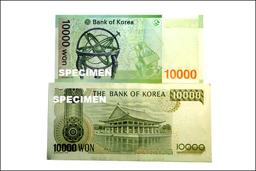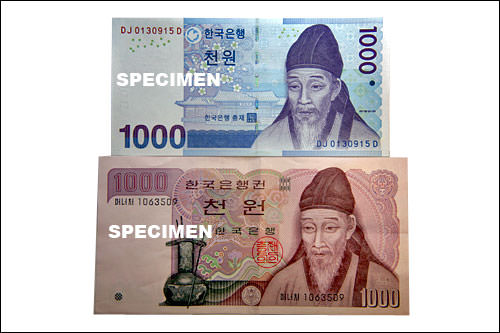 1万ウォン札と千ウォン札 偽造防止導入の新しい紙幣発行。
